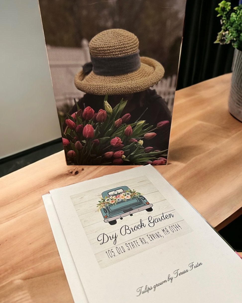Now offering Custom Dry Brook Garden Items featuring our ever popular flower truck logo made by B-Organic from Worcester Ma. Prints are all organic derived from food waste and converted into natural dyes.